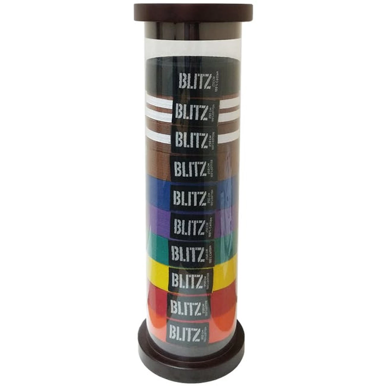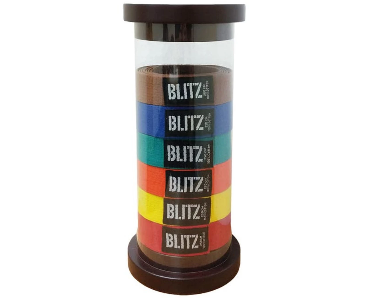 Display your achievements and progression through your respective Martial Art with the Blitz Cylinder Belt Display. The perfect way to commemorate and celebrate your Martial Arts journey, this display is available in six or ten levels. Made from a clear acrylic cylinder with a solid wood base and lid. Belts sold separately.