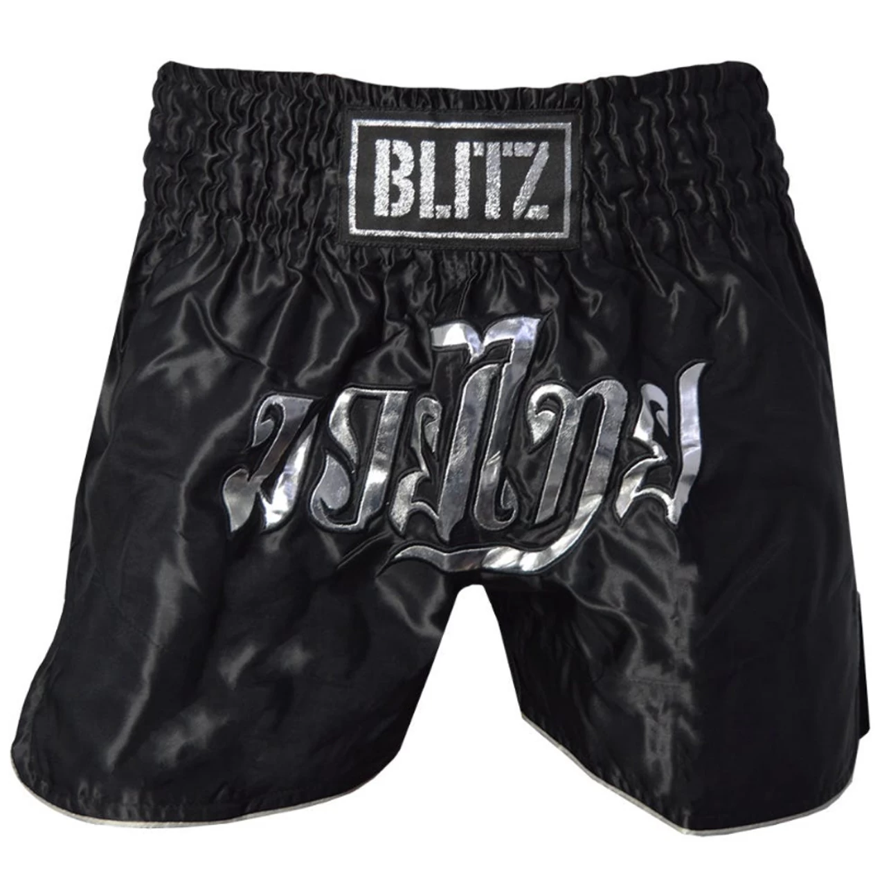 Designed with Muay Thai fighters in mind, our Slim Cut Muay Thai Shorts are ultra-lightweight and free-flowing to allow for a full range of movement. The mid-thigh cut ensures unrestricted movement and, maximises function and comfort for the wearer when training or competing. The shorts are designed to be slimmer and more fitted to the leg, with larger side splits. The large elasticated waistband, with drawstring, provides a secure fit. The minimalistic black base, with a silver trim, Blitz logo on the waistband and shiny silver Muay Thai text on the front, allows clubs, gyms and athletes to add their own choice of branding too. Polyester.