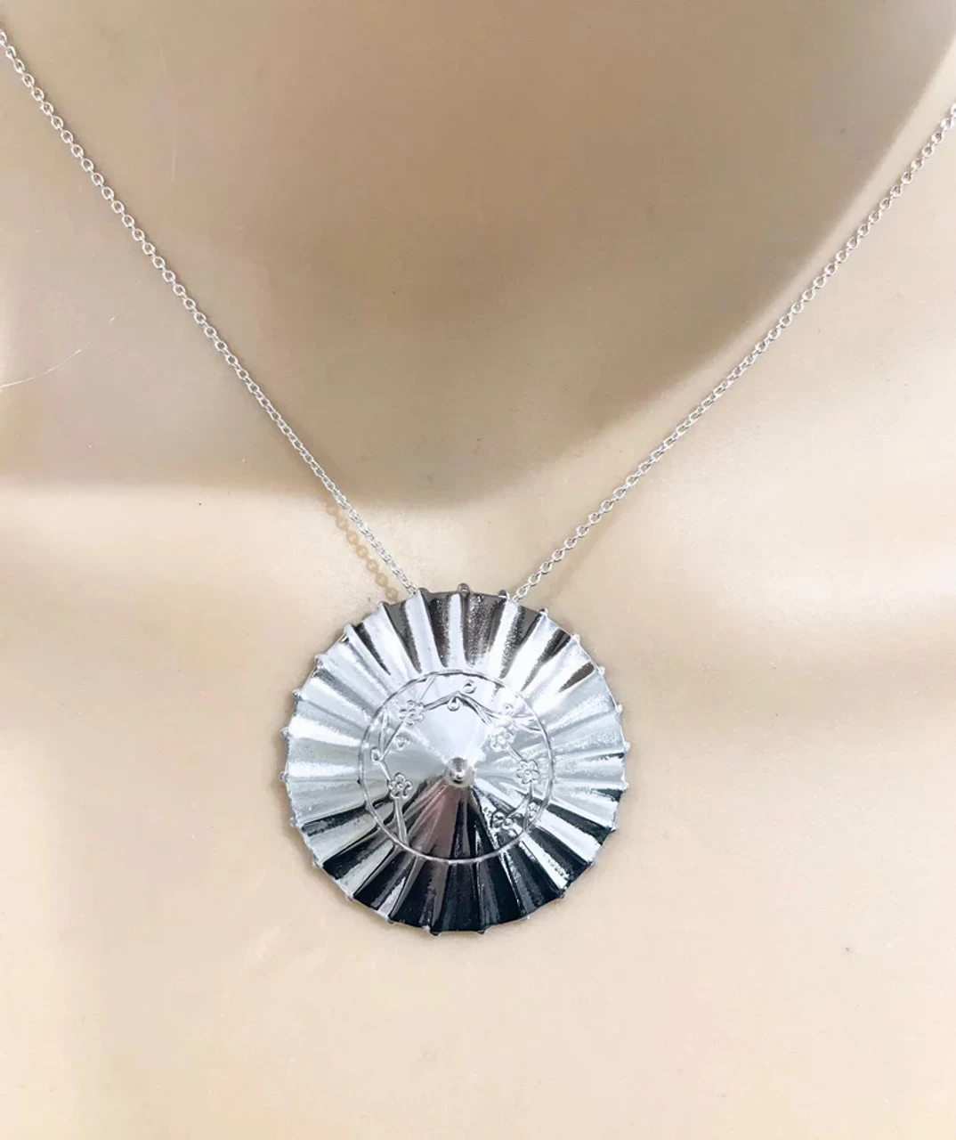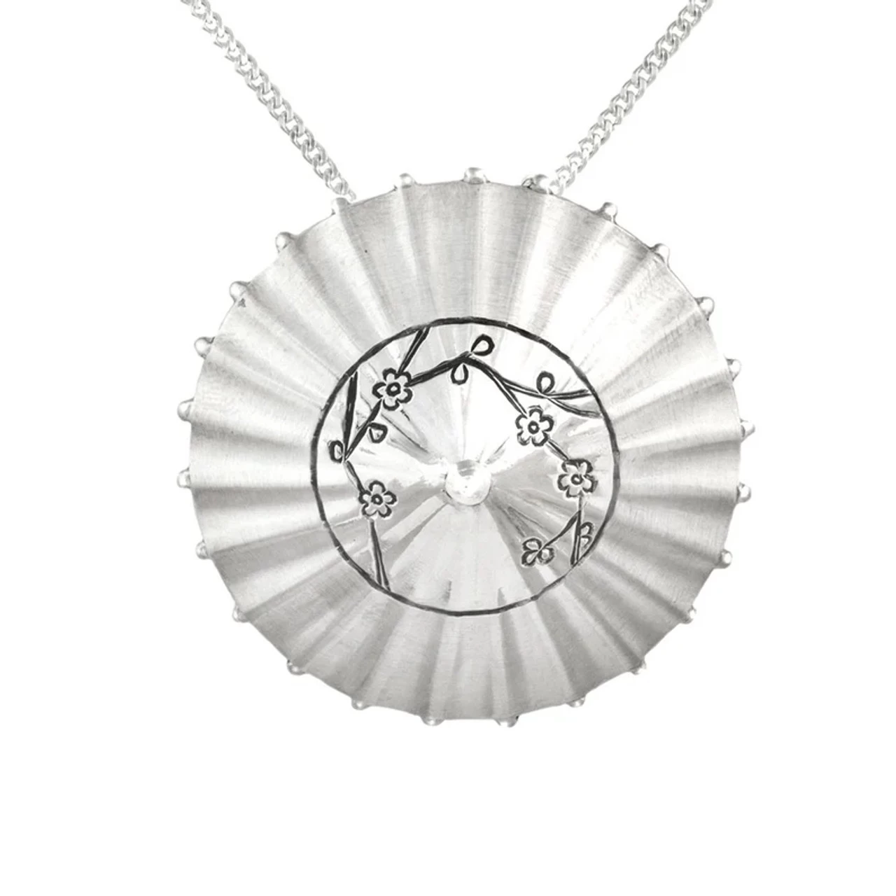 Hand carved, this original and unique design illustrates in fine detail all the components of the Japanese Parasol in a multi dimensional form. The craftsman has also hand engraved patterns from the silk and cleverly textured the silver to replicate the materials used.
