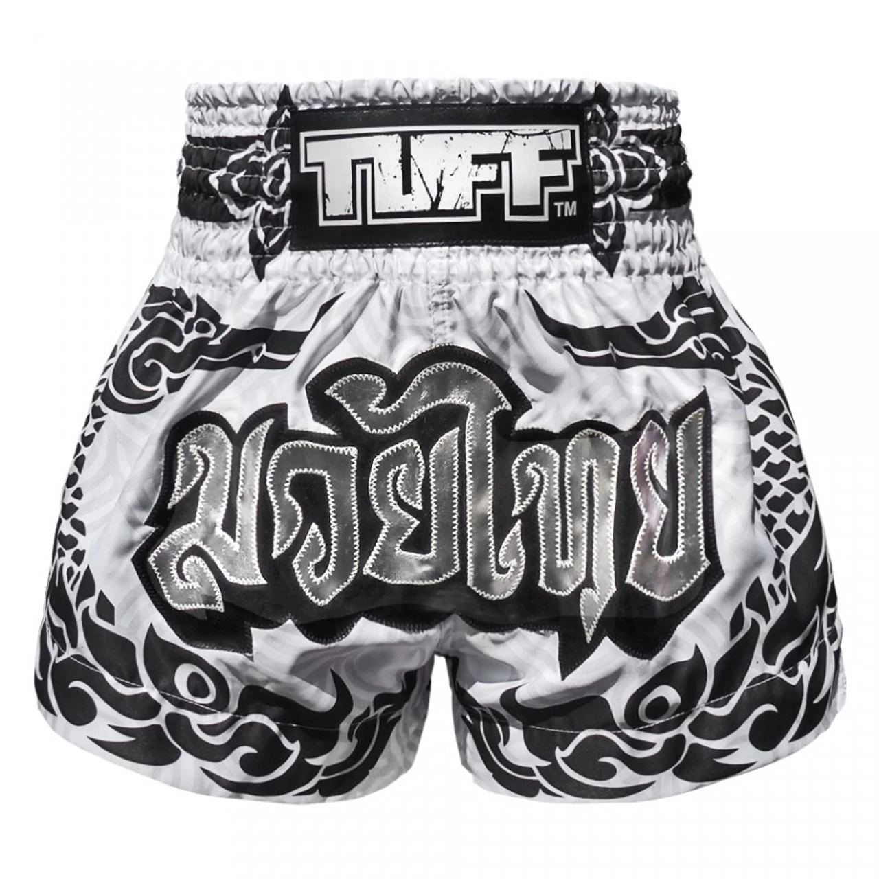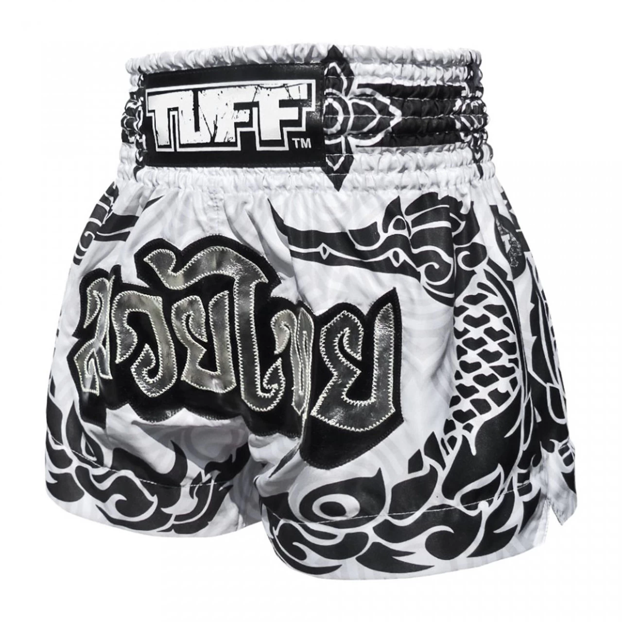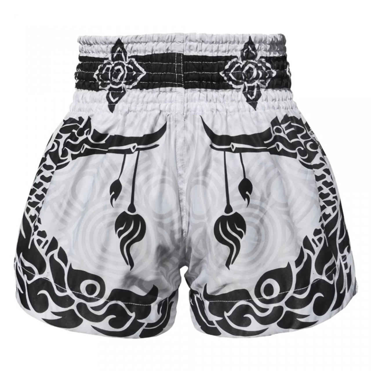 The white boxing shorts feature a black Thai traditional pattern which is influenced by the graceful Hongsa and the guardian of the treasure, Naga.